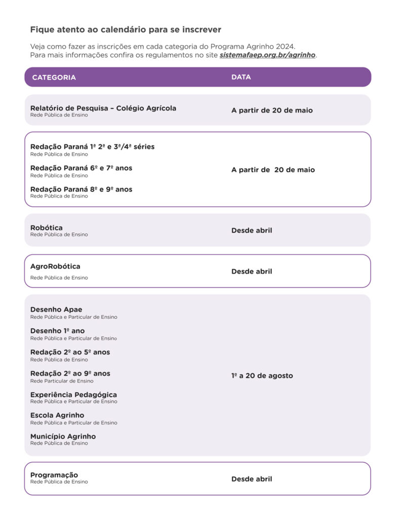 Você pode conferir no regulamento aqui: https://www.sistemafaep.org.br/agrinho/