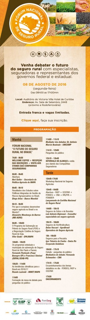 Na próxima segunda-feira, 8 de agosto, a cidade de Curitiba irá sediar o maior evento de seguro agrícola do Brasil. O Fórum Nacional de Seguro Rural irá debater o futuro do seguro agrícola no Brasil e conta na programação com os maiores especialistas do assunto, além de seguradoras, resseguradoras, representantes de produtores, cooperativas e dos governos federal e estadual de São Paulo e do Paraná.