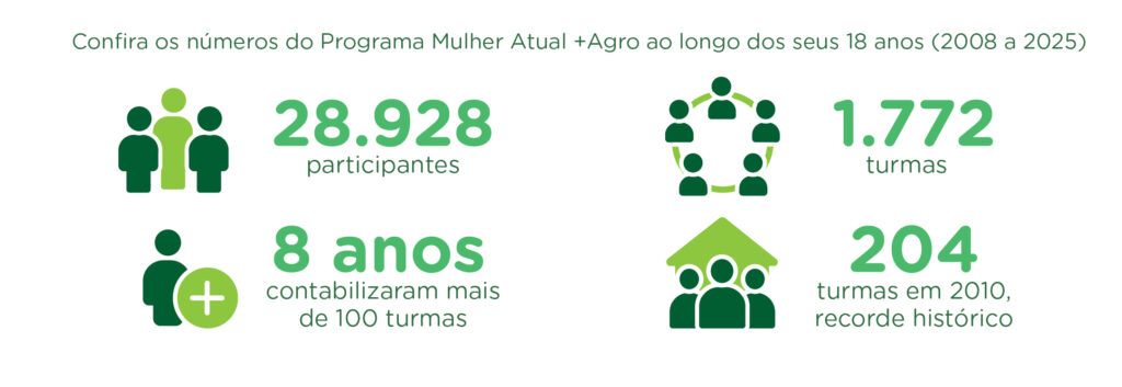 Criado em 2008 pelo Sistema FAEP em parceria com os sindicatos rurais, o Programa Mulher Atual +Agro chega aos 18 anos de atuação com uma nova proposta, alinhada ao crescente protagonismo feminino no meio rural. Ao longo dessa trajetória, a iniciativa já alcançou quase 29 mil participantes em todo o Paraná, consolidando-se como uma importante ferramenta de capacitação de produtoras rurais.
