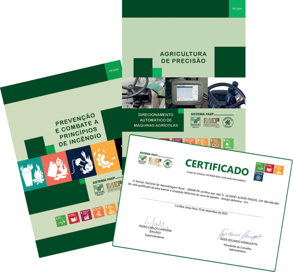 No caso do curso “Aplicação de agrotóxicos – NR 31.7”, um dos títulos mais procurados há décadas, o produtor vai encontrar os selos dos ODS 2, 3, 4, 8, 12 e 15 na capa da cartilha. O “Manejo de solo” está atrelado aos objetivos número 2, 4, 12 e 15. Ao consultar uma capacitação na seção de cursos do site do Sistema FAEP, também é possível visualizar os ODS relacionados a cada título. Os selos também estarão nos certificados de cada capacitação.