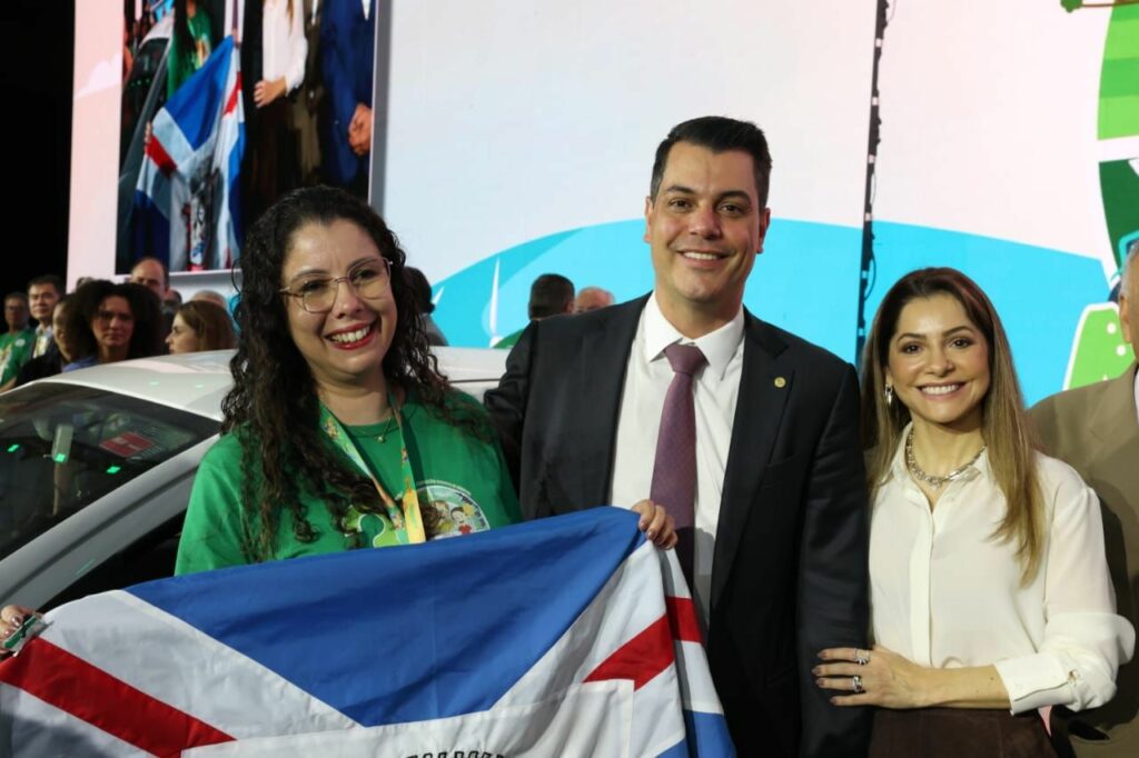 Angrenni Assunção ao lado do presidente interino, Ágide Eduardo Meneguette, e a esposa, Hemily