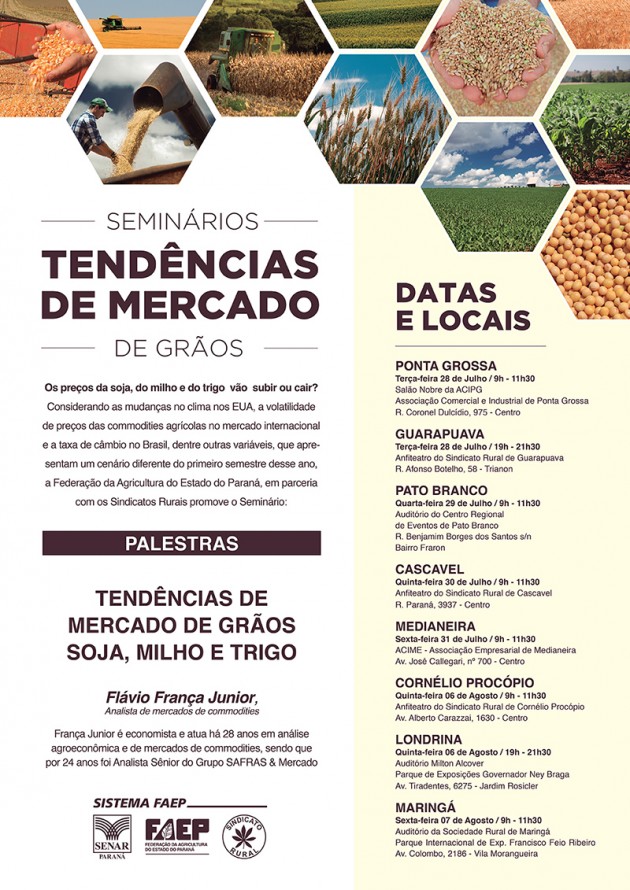 Os preços de soja, milho e trigo vão subir ou cair? De 28 de julho a 07 de agosto Ponta Grossa, Guarapuava, Pato Branco, Cascavel, Medianeira, Cornélio Procópio, Londrina, Maringá Entrada franca Público-alvo: produtores rurais, agrônomos, estudantes, profissionais de cooperativas e bancos. Objetivos: · Apresentar leituras de cenário e análises de mercado. · Discutir as […]