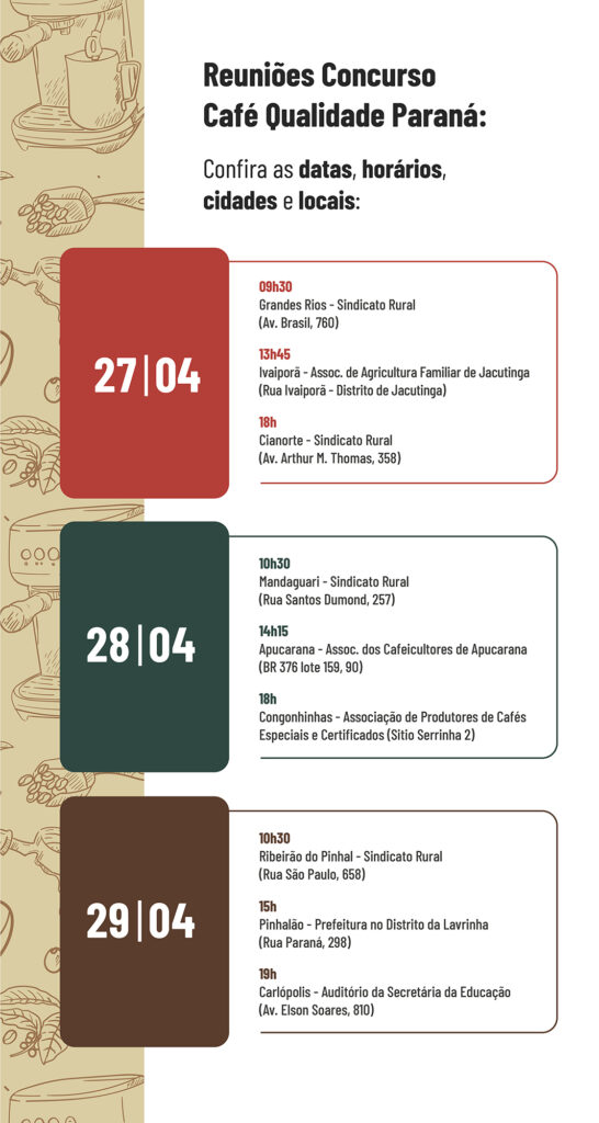 A programação é voltada para médios e pequenos produtores, abrangendo a região Norte Pioneiro do Paraná, conhecida pelas condições favoráveis ao cultivo de cafés especiais. No dia 27 deste mês, as reuniões ocorrem em Grandes Rios, Ivaiporã (Comunidade do Jacutinga) e Cianorte. Já no dia seguinte (28), os encontros serão em Mandaguari, Apucarana e Congonhinhas. Fechando a série (29), Ribeirão do Pinhal, Lavrinha e Carlópolis recebem os técnicos.
