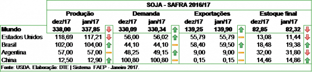 Os estoques americanos, bem como os estoques mundiais também sofreram cortes acima do esperado. A produção mundial na temporada 2016/17 é estimada em 337,85 milhões de toneladas, com redução nos Estados Unidos, e aumento na estimativa de produção brasileira para 104 milhões de toneladas. A produção na Argentina ainda foi mantida em 57 milhões de toneladas, apesar do Ministério da Agricultura do país revisar a produção para os 56 milhões de toneladas. As estimativas de produção na América do Sul conservam o otimismo apesar das ameaças climáticas.